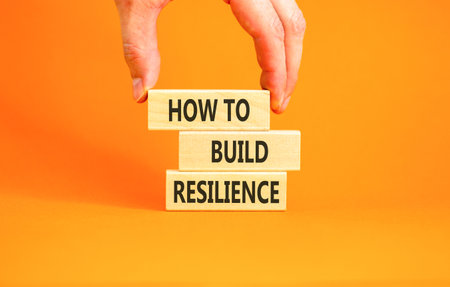 How to build resilience symbol. Concept words How to build resilience on beautiful wooden blocks. Beautiful orange background. Businessman's hand. Business how to build resilience concept. Copy space