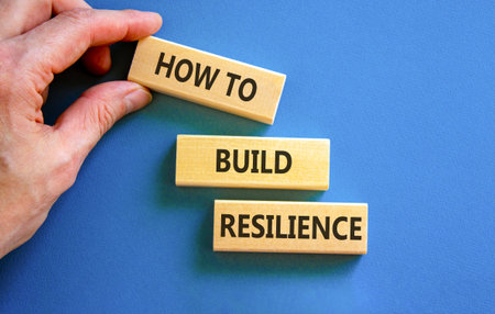How to build resilience symbol. Concept words How to build resilience on beautiful wooden blocks. Beautiful blue background. Businessman's hand. Business how to build resilience concept. Copy space