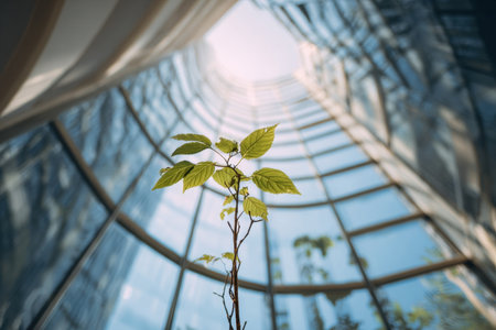 A sapling grows upward, reaching for light in modern glass atrium, symbolizing resilience and hope