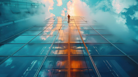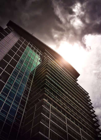 This photo showcases a towering building reaching into the sky with a multitude of windows, Storm clouds casting dramatic shadows on glass skyscrapers, AI Generated