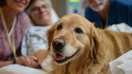 Smiling golden retriever visits hospital patients in a warm and comforting environment