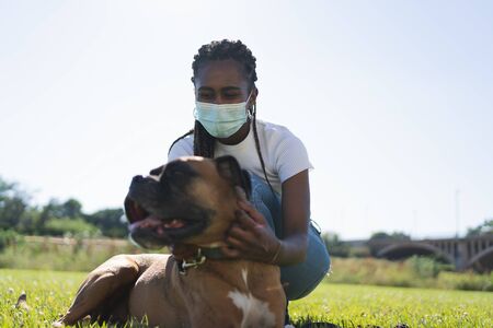 Selective focus on an ethnic african woman wearing a protective mask holding a boxer dog that is lying on the grass with a bridge on the background