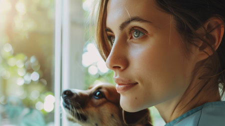 A Felidae and a woman gaze out the window, their noses almost touching. The cats iris dilates as it spots a fawn outside. The womans jaw drops in awe at the felines carnivorous gesture AIG50
