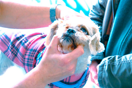 A closeup of a furry Pekingese toy dog being pet by its owner