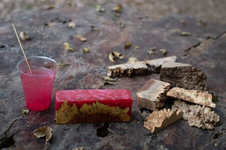 Casting red epoxy resin burl wood cube on old table art background, Nature Afzelia wooden