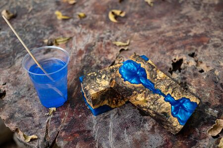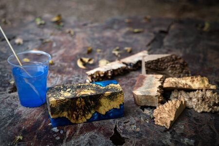 Casting blue epoxy resin burl wood cube on old table art background, Nature Afzelia wooden