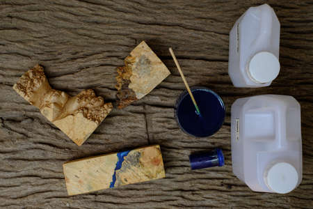 Mixing color blue epoxy resin in a glass cup for casting burl wood on old wooden table background