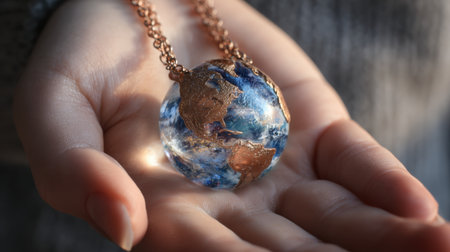 A close-up photograph featuring a hand holding a beautiful globe pendant, representing Earth in stunning blue and metal. Ideal for creative jewelry designs.