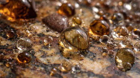 This stunning close-up image captures water drops on a natural stone surface, showcasing a mix of sizes and reflective qualities that highlight organic beauty.