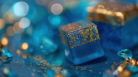 Captivating close-up of blue resin cubes adorned with gold glitter, surrounded by shimmering bokeh and decorative elements, evoking elegance.