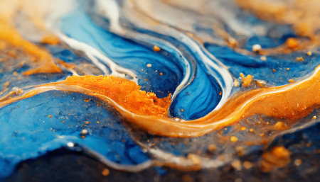 This spectacular image showcases vibrant blue and orange liquid ink seamless blending in a mesmerizing swirl, enhanced by realistic textures that highlight every intricate detail of this