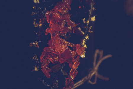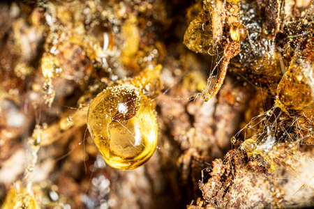 As the stones of amber splashed resin over the bark of the wood. Coniferous tree species close-up. Macro of amber resin droplets. The spring sun plays with rays and is reflected from the resin