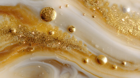 This abstract image showcases a mesmerizing blend of gold and white swirls with a glittery texture. Ideal for elegant design projects and wallpapers.