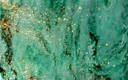 Colored canvas with marble texture, golden smudges, sparkles green background. Abstract background