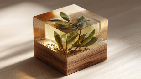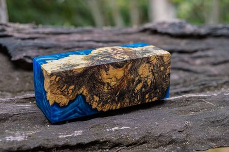 Cube casting epoxy resin with nature burl BURMA PADAUK and maple wood on the old table