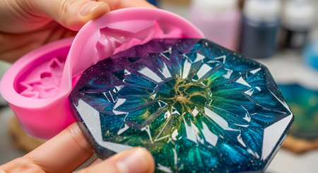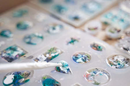 Crafting resin molds with colorful designs in progress.