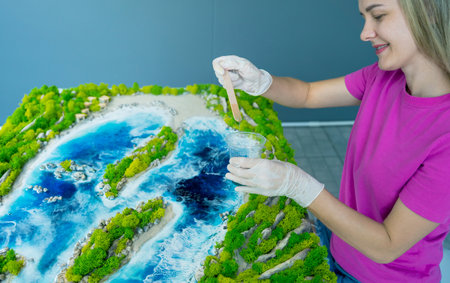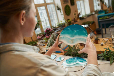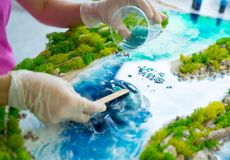 Creating beautiful epoxy resin art with DIY techniques in a well-lit studio setting