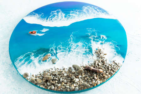 Resin art painting. Epoxy art composition with blue ocean waves, boat and stone beach.