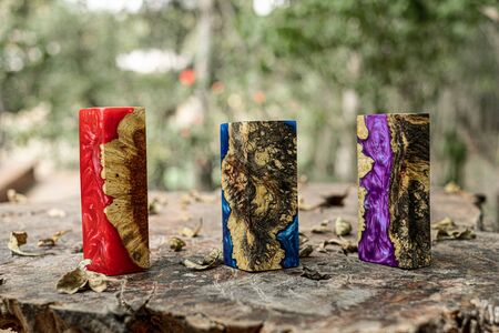 Cube casting epoxy resin with nature burl BURMA PADAUK and maple wood on the old table