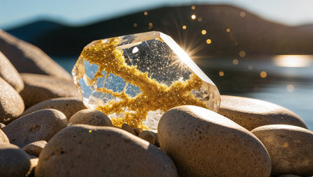 Golden-hued crystal glimmers amidst pebbles, reflecting sunlight in a serene lakeside setting during sunset.