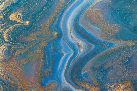 Marble abstract acrylic background. Blue marbling artwork texture. Agate ripple pattern. Gold powder.