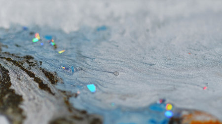 Liquid marble texture. Ink spill. Blur gray white color metallic blue golden sequin particles pigment dust acrylic paint emulsion fluid wave abstract art background.