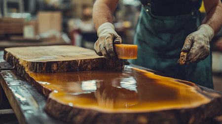 A focused artist meticulously applies layers of resin onto a wooden surface in a workshop, showcasing craftsmanship and attention to detail. The vibrant resin enhances the wood's natural beauty.