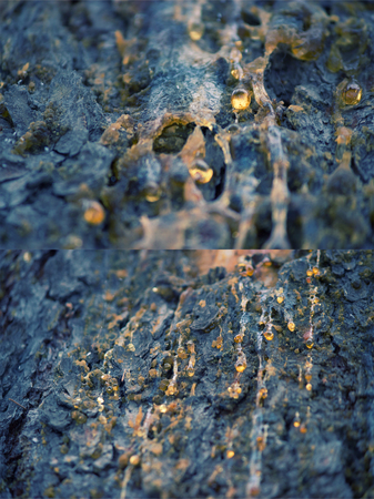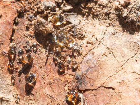 As the stones of amber splashed resin over the bark of the wood. Coniferous tree species close-up. Macro of amber resin droplets. The spring sun plays with rays and is reflected from the resin