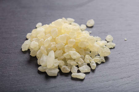Mastic resin tears. Chios mastic isolated on wood background, closeup view