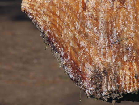 Close up of cut tree stump with sticky, oozing and dried sap.