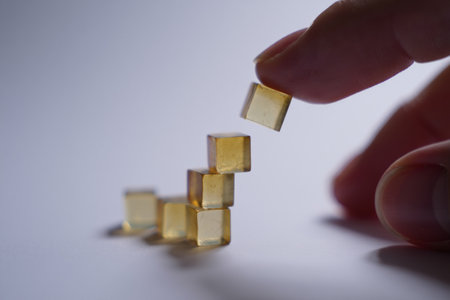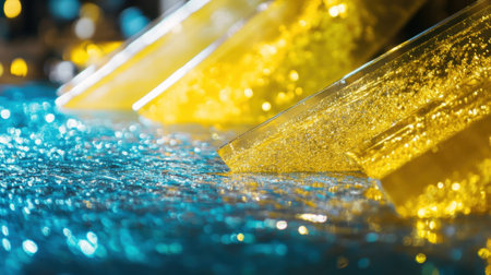 Captivating close-up of blue resin cubes adorned with gold glitter, surrounded by shimmering bokeh and decorative elements, evoking elegance.