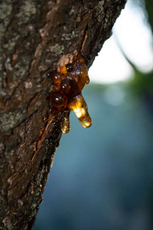 Beautiful sticky yellow and transparent sap tree accumulated on the wound of the tree bark
