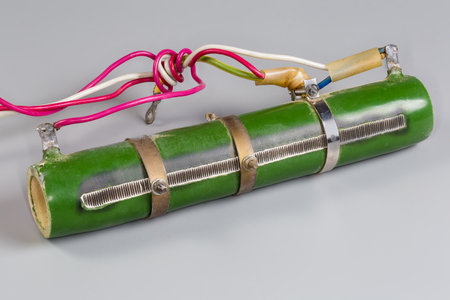 High-power wirewound adjustable resistor on a ceramic core protected with green enamel coating and several tapping points to which soldered electric wires on a gray surface