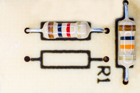 The macro-sized photo of two electrical resistors with various colored stripes, soldered onto a computer electrical board.