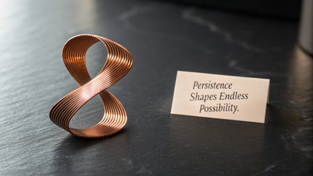 Elegant bronze infinity sculpture rests beside a sign displaying words about persistence in a modern setting, perfect for representing limitless potential and unwavering determination.