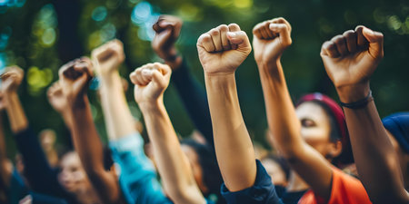 Group of people raising their hands in the air with their fists raised. Generative AI.