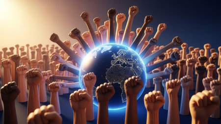 Diverse hands raise in unity around globe. Protest, global, unity.