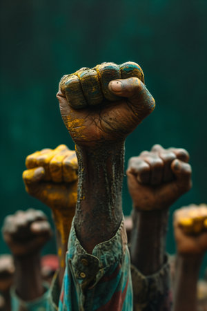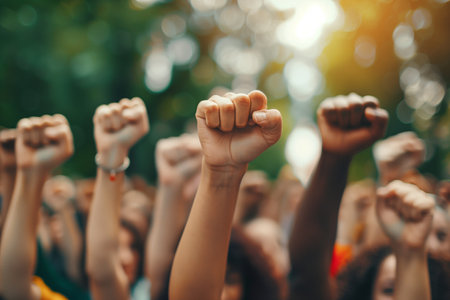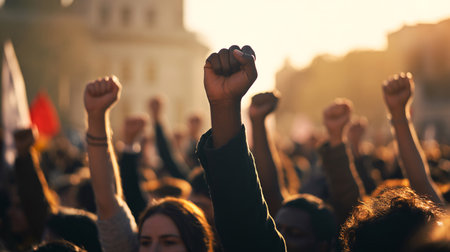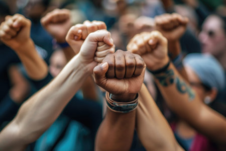 This image captures the essence of a peaceful protest with a powerful raised fist symbolizing unity and resistance, a resounding message of solidarity in the face of change