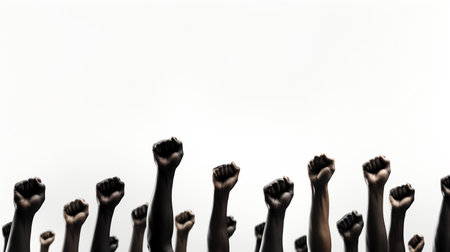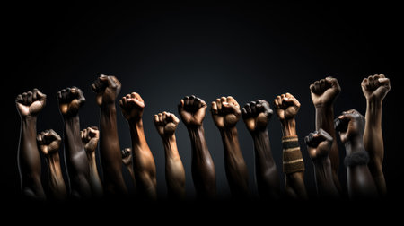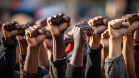 Juneteenth, Black Lives Matter concept. Close-up black hands fists raised up in protest, rally, demonstration, fight for rights. Generative AI.