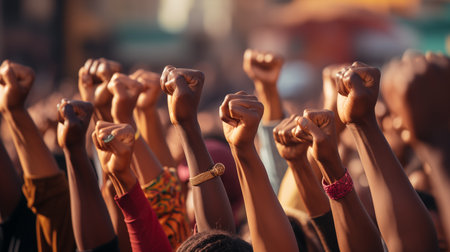 Hand of African American individual raised in defiance at a protest, surrounded by a blurred crowd, representing unity, strength, and social justice