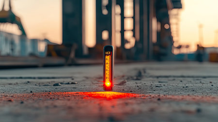 A striking image capturing a bright red light beam on a concrete surface at a construction site during sunset. The warm tones create a unique atmosphere.