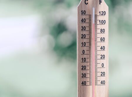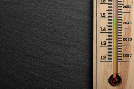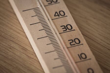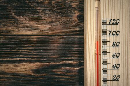 Wood thermometer calibrated in degrees celsius on the wooden wall, concept of world hot and weather.