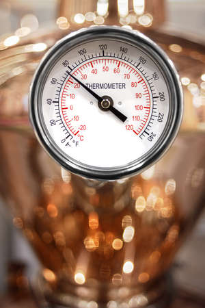 Round white arrow thermometer close-up on a copper tank distiller