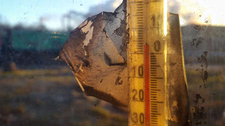 Street thermometer behind a window glass close up