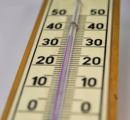 Old vintage round thermometer red arrow at 25 degrees close up