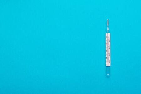 A glass thermometer for measuring the temperature of the human body, blue background.