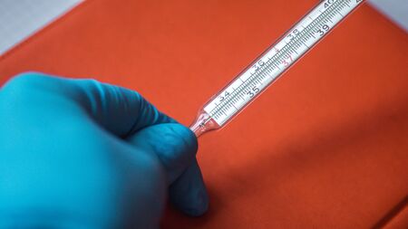 glass thermometer and hand in blue glove close-up on the background of the Medetsyn mask