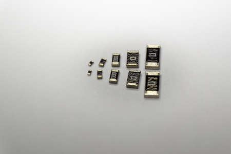 Abstract macro close-up of SMT surface mount chip resistors smart power electronics components isolated on white background mounted with precision equipment