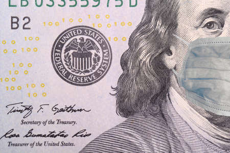 Coronavirus COVID-19 in USA. 100 dollar money bill with face mask. World economy hit by corona virus outbreak and pandemic fears. Coronavirus affects global stock market. Finance and crisis concept.