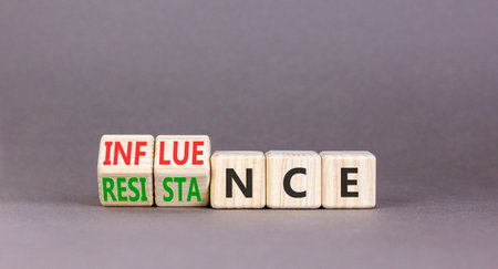 Influence or resistance symbol. Concept words Resistance to Influence on beautiful wooden cubes. Beautiful gray table gray background. Business and influence or resistance concept. Copy space.